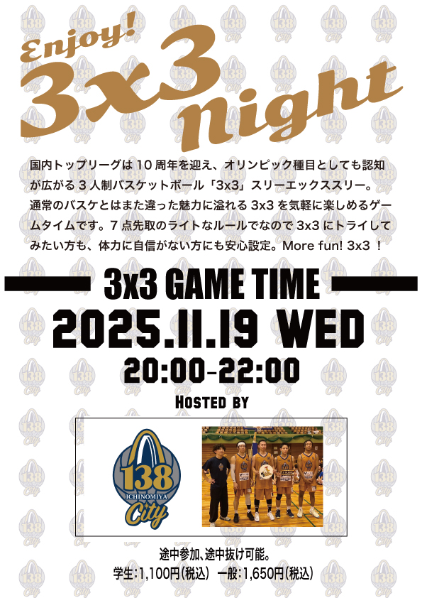 今月は第3水曜日、ひとりで来てもこのエリアのトップレベルの選手たちと3×3が楽しめる「3×3 Night」!